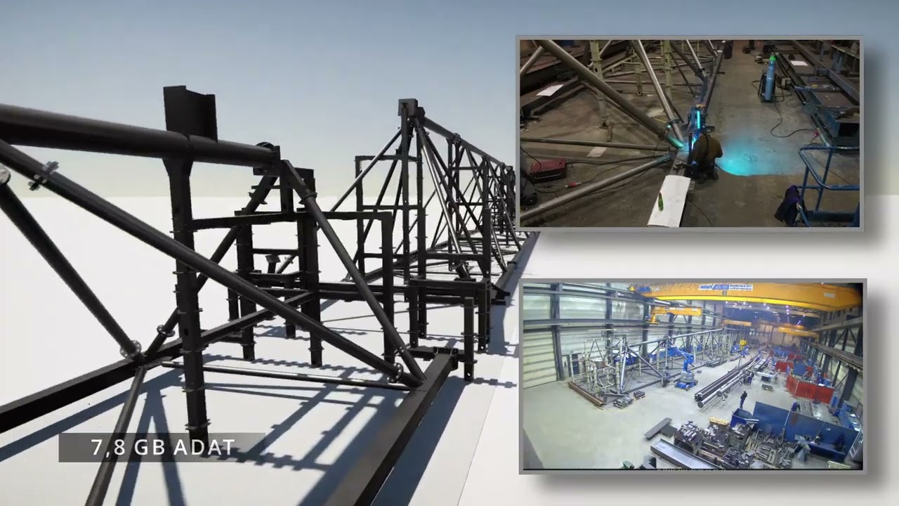 The gate frame is assembled in the hangar in the horizontal position. It is rotated to an upright position in the first phase with the help of two larger and two smaller capacity cranes, after which the two higher capacity cranes are lifting it into place. Because of this, crane ropes do not need to be reconnected in subsequent stages. The installation of the hangar gate follows all these steps.