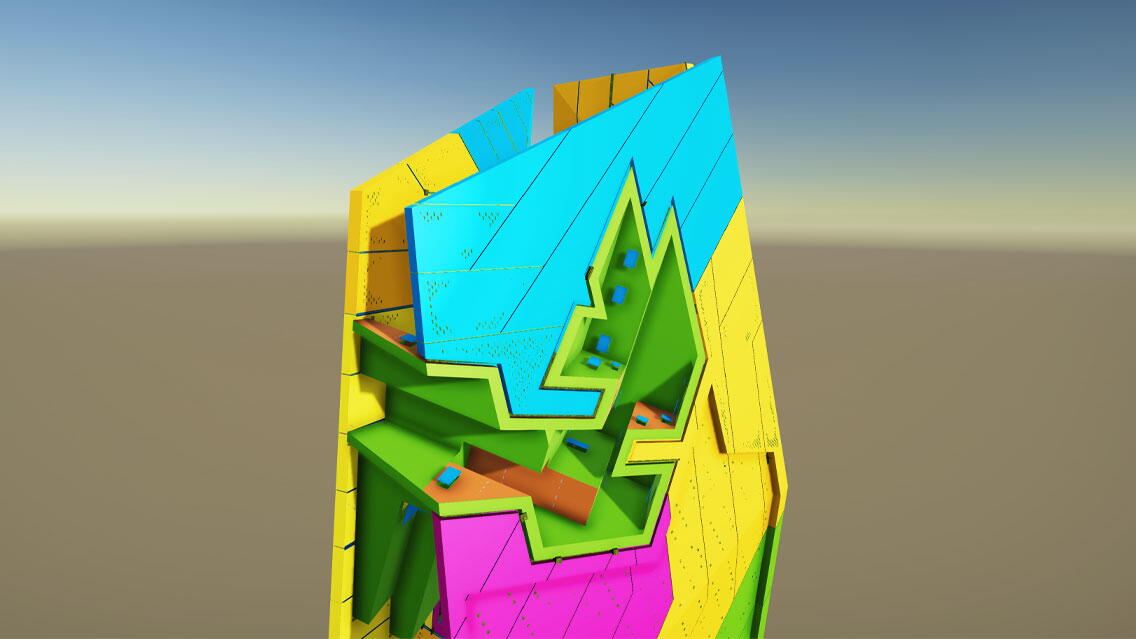 The three towering petals surround a pedestrian-accessible central void. Suspended overhead is a sculptural entity that holds and stabilizes the three sides of the billboard.
