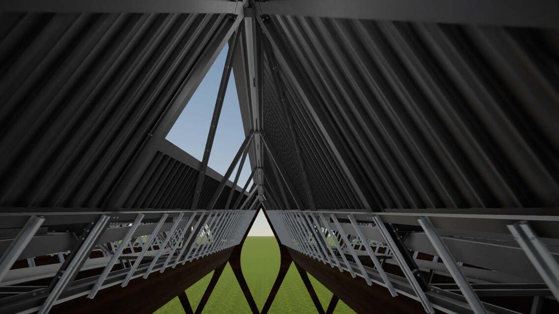 Cerca de 100 toneladas de aço foram necessárias para a construção da estrutura metálica. Com vão de 25m, as vigas treliçadas são inclinadas e mantêm-se unidas. Nenhuma parte da estrutura é vertical ou horizontal, e toda a parte interna foi coberta com metal expandido de alumínio ou revestimento de madeira.