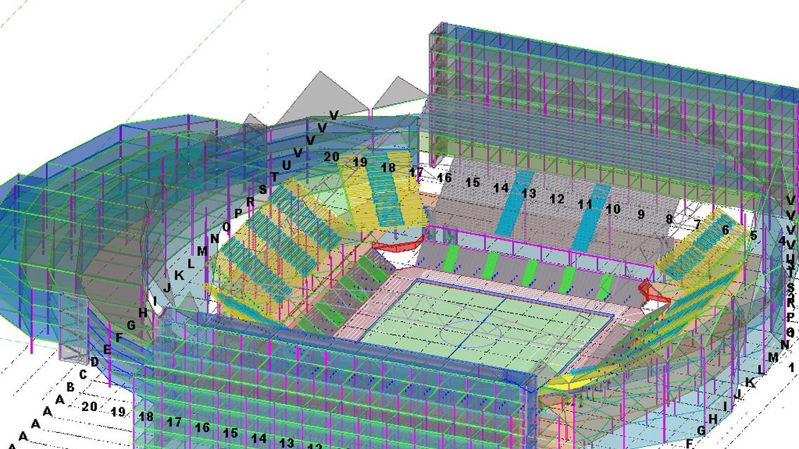 The stadium is designed using TEKLA software for BIM AWARD 2016.The stadium made up of composite materials with different profiles in various elevations.The stadium which i have designed for MULTIPURPOSE such as athletics,hockey,football and also some indoor games(ground type).The seating capacity of stadium as 80,000 to 90,000 members.The stadium FACILITIES with large parking spaces on both sides,dressing rooms,rest rooms and park(left side).
