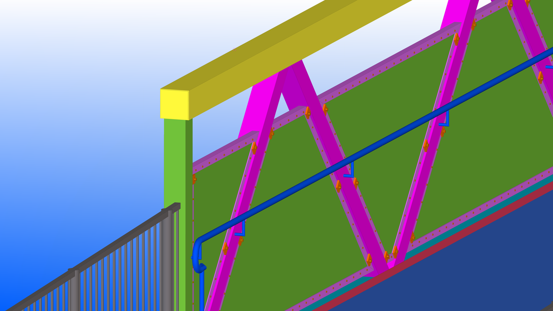 Vidare har användandet av Tekla Structures medfört att vi känt oss säkra på att alla nya delar passar ihop med varandra. Ett exempel på detta är räckesramarna. Utan en modellering i 3D hade det varit svårt att fånga upp de små variationer mellan ramarna som vi med hjälp av Tekla Structures nu kunnat göra. Fästöron med hål för infästning av ramar har placerats för att passa respektive ram. När bron sedan levereras kunde varje ram enkelt skruvas på plats. En bit av befintlig bro har mätts in och modellerats. Med detta har vi kunnat anpassa och säkerställa att det nya stödet passar bra mot befintligt. Samma stöd är format som en "kantarell", vilket lett till en svår armering. Vi vet ändå att den armering vi lagt in passar och blir rätt.
