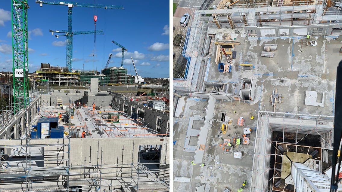 These twinwalls were manufactured at KPC’s production plant in Oranmore (Co. Galway) and include provisions for pre-coordinated electrical and mechanical sockets. Peripheral walls of the building are 180mm solid walls, designed to bear loads from the façade and external balconies, and were manufactured at KPC’s production plant in Brownstown (Co. Kildare) with vent openings.