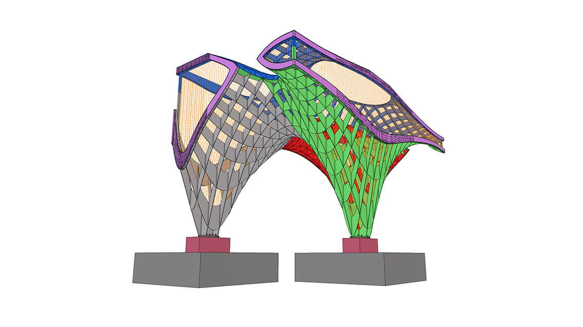 Tekla's ability to import many different model types, ​from the sculpture system, to the wood elements, and the cable system is what ultimately proved successful to this project. One of the challenges on this project was deciding where and how to create the shop splices for each assembly. The sculpture was divided into four shop-welded assemblies before being ​welded together in the final configuration.Â